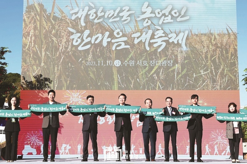 [축산신문 김수형 기자] 제28회 농업인의 날 기념식이 윤석열 대통령이 참석한 가운데 경기도 수원 서호잔디광장에서 지난 10일 열렸다. 이날 행사는 윤 대통령을 비롯한 전국의 많은 농업인들이 모여 지난 1년의 노고를 위로하고 앞으로의 농업·농촌을 위해 서로 격려하는 시간을 가졌다. 사진은 윤석열 대통령과 이성희 농협중앙회장, 이학구 한국종합농업단체협의회장, 이승호 한국농축산연합회장이 청년 농업인들과 함께 기념촬영을 한 모습.