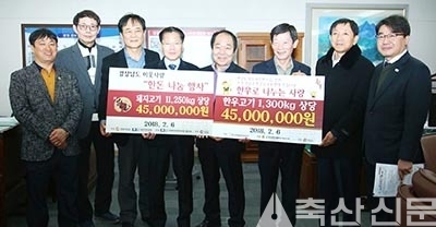 전국한우협회 부산경남도지회(회장 강호경)와 대한한돈협회 경남도협의회(회장 지춘석)는 지난 6일 경남도청을 찾아 민족 고유명절, 지역사회 소외계층과 함께 하고자 9천만원 상당의 한우·돼지고기를 전달<사진>했다.