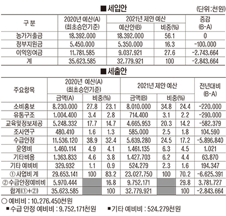 정부지원금도 1억원이 감소했다. 다만 농가거출금은 올해와 같다.