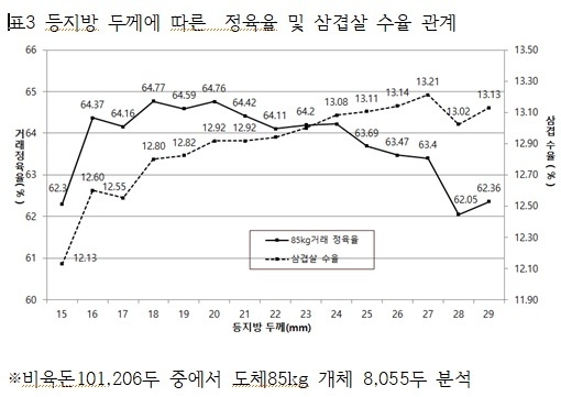 이러한 결과는 최근 육가공 회사가 등지방이 다소 두꺼운 것을 선호한다는 것과 같은 맥락으로 이해해도 좋을 것이다. 왜냐하면 등지방이 두꺼워질수록 정육률이 떨어져도 상대적으로 삼겹살 수율이 올라가서 비육돈 1두당 부분육 매출액은 향상되고 삼겹살 상품성도 좋아지는 경향이 있기 때문이다.