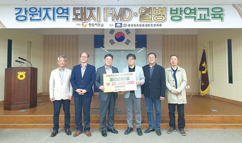 강원양돈농협(조합장 최덕식)은 지난 17일 강원양돈농협 본점대회의실에서 대한한돈협회 강원도협의회(회장 이재춘)에 발전기금 2천만원을 전달했다.