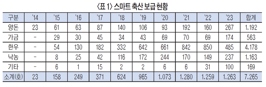 정부는 지난 2014년부터 ‘축산분야 ICT 융복합 확산사업’ 등을 통해 지난해까지 총 7천265호의 축산농장에 스마트 축산을 보급했다. 이는 지난해 기준 전업농가 3만1천500여호의 23.1% 수준이다. 축종별로는 한우농가가 58%로 가장 많았다. 양돈, 낙농가가 각각 16%, 가금농가는 7.7%로 뒤를 이었다.<표1 참조>
