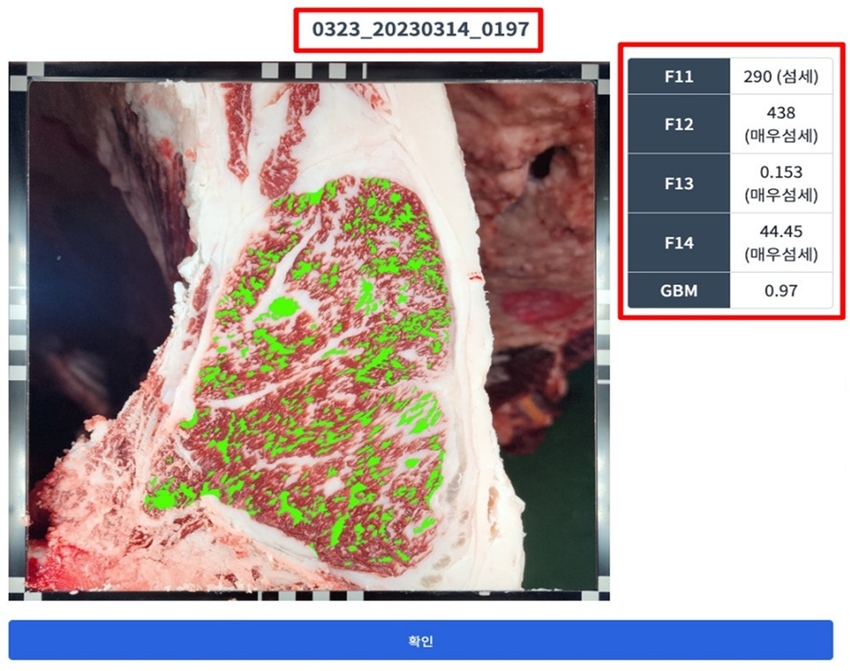 이번에 출원된 특허 중 하나는 딥러닝 기술을 접목한 ‘소 근내지방 섬세지수 분석 알고리즘’<사진>으로, 이는 이미지 분석을 통해 축산물의 근내지방 섬세지수와 지방면적비를 정밀하게 분석할 수 있는 혁신 기술이다. 이 알고리즘은 기존의 분석 방법보다 정확성과 신속성이 높아 추후 축산물 등급판정의 과학화 및 객관성 향상에 기여할 것으로 기대된다.