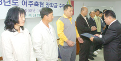 【경기】 여주축협(조합장 김인기)은 지난 14일 조합 회의실에서 2008년 장학금 전달식<사진>을 가졌다. 여주축협은 이날 조합원 자녀 중 대학생 30명에게 100만원씩 총 3천만원의 장학금을 전달했다.
