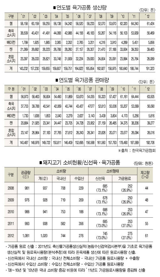 국민 1인당 육가공품 소비량은 1970년 0.1kg에 불과했지만 2012년 3.8kg까지 성장했다. 그러나 독일 40kg, 미국 42kg, 일본 6.5kg에 비하면 한참 모자란 상황이다. 2012년 기준 육가공품의 생산량은 햄 6만4천239톤 소시지 5만6천469톤, 베이컨 5천856톤, 캔햄 3만8천205톤으로 2011년과 비교해 0.2% 증가했다. 쉽게 조리할 수 있는 소시지의 경우 전년 대비 6.0%, 베이컨은 10.5%까지 늘었다. 재고관리와 보관이 용이한 캔햄의 경우 맞벌이 부부 증가와 명절선물세트 판매로 꾸준히 증가하고 있다.