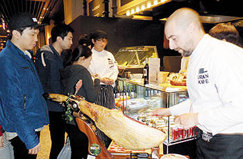 프리미엄 메쯔거라이 어반나이프(대표 유호식)는 지난 4일 갤러리아백화점 명품관 고메이494에서 입점기념으로 최고급 하몽인 아베리코 레세보의 카빙 시연과 시식행사<사진>를 가졌다.