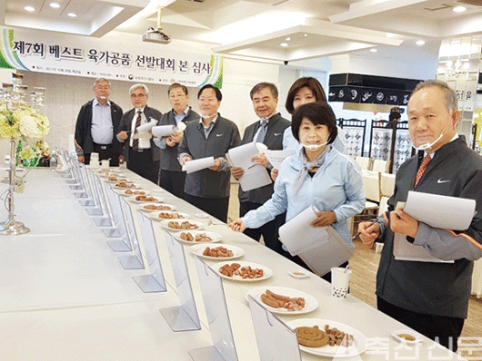 최고의 육가공품을 가려라. 지난 26일 농림축산식품부 주최, 한국육가공협회 주관으로 ‘2017 제7회 베스트 육가공품 선발대회’가 열렸다. 이날 선발대회에는 국내 각계 전문가들이 심사위원으로 참석, 11개사에서 출품한 6개 유형의 42개 제품을 놓고 최선을 다해 ‘베스트’를 가리는 열정을 보였다. 오른쪽부터 윤봉중 본지회장, 김연화 소비자공익네트워크회장, 임경숙 대한양양사협회장, 김세헌 한국축산식품학회장, 최명철 농식품부 축산정책과장, 이문용 육가공협회장, 임성천 식육마이스터교장, 정승희 육가공협회 기술고문.
