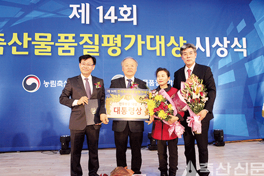 올해 전국축산물품질평가대상 최고상인 대통령상에 경남 김해 한우농가 홍수범씨가 선정됐다. 농림축산식품부와 축산물품질평가원(원장 백종호)은 지난 10일 세종 소재 축평원 대회의실에서 ‘제14회 전국축산물품질평가대상’ 시상식을 개최했다. 이날 한우농 홍수범씨가 대통령상을 수상했으며 국무총리상은 한돈 부문 송일환(충남 공주), 농림축산식품부장관상은 한돈 부문 김영진(충남 논산), 육우 부문 윤용하(경기 안성), 계란 부문 유재흥(경기 포천)씨에게 돌아갔다. 이와함께 축산물품질평가원장상과 축종별 생산자단체장상 등 총 34개 농가가 수상의 영예를 안았다. 영예의 대통령상에 선정된 홍수범씨는 한우 200두(비육우 140두, 송아지 60두)를 사육하는 비육 전문 농가로 11개월 간 51두를 출하한 결과 등급판정 결과가 가장 우수했다. 특히 한우 거세우 육질 1+등급 이상 출현율이 전국 평균인 57.0% 보다 41.0%P 높은 98.0%였으며, 1++등급 출현율은 82.3%로 전국 평균 출현율 15.9%보다 66.4%P 높았다. 올해로 14회째를 맞는 전국축산물품질평가대상은 가장 좋은 품질의 한우·한돈·육우·계란 생산 농가에게 주어지는 상이다. 수상농가는 2015년 10월