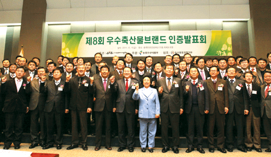 지난 16일 서울 프레스센터에서 열린 2011년 우수 축산물 브랜드 인증 발표회에서 김재옥 소비자시민모임 회장을 비롯한 우수 축산물 브랜드 인증 수상자들이 기념촬영을 하고 있다. 소비자시민모임은 2011년 우수 축산물 브랜드로 경주천년한우, 보들결제주한우, 치악산한우, 햇토우랑, 생생포크, 셀록포크 등 신규브랜드를 포함해 한우, 양돈, 육계 50개 브랜드가 선정됐다.