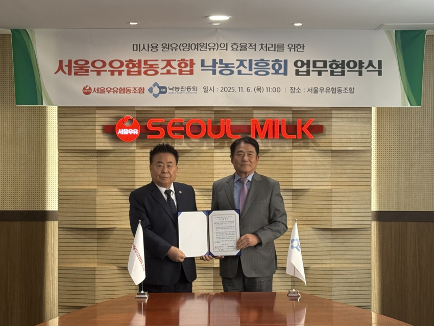 낙농진흥회(회장 김선영)와 서울우유협동조합(조합장 문진섭)은 지난 6일 미사용 원유의 효율적 처리를 위해 분유처리 시설을 공공개념으로 활용하기로 업무협약(MOU)을 체결했다. 이번 협약은 최근 국내 원유수급의 불균형 및 미사용 원유 발생에 따른 처리 부담을 완화하고, 원유 자원의 효율적 활용을 통한 낙농산업의 지속가능한 발전 기반을 구축하기 위해 마련됐다.