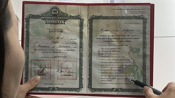 유목민 등록증은 몽골 정부에서 공식적으로 유목민이라는 것을 인정해주는 제도다. 지난 2013~2020년 진행됐다.