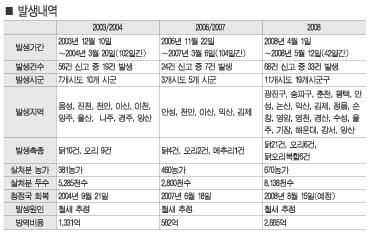특히 과거 두 차례의 경우 동절기에 발생했기 때문에 방역당국은 물론 가금업계는 당혹감을 감추지 못했다. 이번에 발생한 HPAI는 68건의 의심축 신고가 접수됐으며 이중 42건이 양성으로 판정됐으며 발생건수는 33건으로 기록됐다. 이는 2003/04년도 19건, 2006/07년도 7건이 발생했던 것에 비해 가장 많은 발생건수를 기록했다. 발생건수 뿐만 아니라 발생지역도 가장 광범위했다. 2008HPAI가 발생된 지역은 가금류 사육밀집 지역에서 시작돼 서울, 부산 등 대도시권까지 발생했으며 충북도와 제주도를 제외한 전국이 AI 발생지역에 포함됐다. 발생지역을 살펴보면 우선 최초 발생지역인 전북 김제를 비롯해, 정읍, 익산, 순창과 함께 전남 영암, 경기 평택, 안성, 강원 춘천, 경북, 영천, 경산, 울산 울주, 경남 양산에서 발생됐다. 더욱이 서울 광진구와 송파구, 부산 기장군과 해운대구, 강서구, 대구 수성구 등 대도시도 발생지역에 포함됐다. |