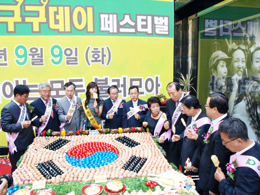 9월9일 ‘구구데이’를 맞아 서울 명동에서는 ‘구구데이 페스티벌’이 열렸다. 양계 관련 지도자들이 계란으로 태극기를 형상화한 무대 앞에서 계란말이꼬치를 시식하고 있다. 왼쪽부터 이준동 양계협회장, 이상진 축산과학원장, 서성배 계육협회장, 탤런트 한채아씨, 오세관 농협축산지원부장, 오종길 한국양계조합장, 안승춘 식생활개선연구회장, 최홍근 계란유통협회장, 김용진 오리협회 전무, 안병철 대충양계조합장, 김영만 농식품부 사무관.