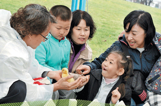 장애우들로 하여금 동물과 가까이 하도록 함으로써 장애우들이 정신적 안정과 신체적 균형감각을 높여주기 위한 장애우 동물사랑 행사가 농진청 축산과학원에서 개최됐다. 제29회 장애인의 날을 맞아 열린 이 행사는 소, 돼지,오리, 염소 등 동물과 함께하는 행사로, 장애우들로부터 좋은 반응을 얻었다. 행사장에서 장애우들이 병아리를 보며 좋아하는 모습.