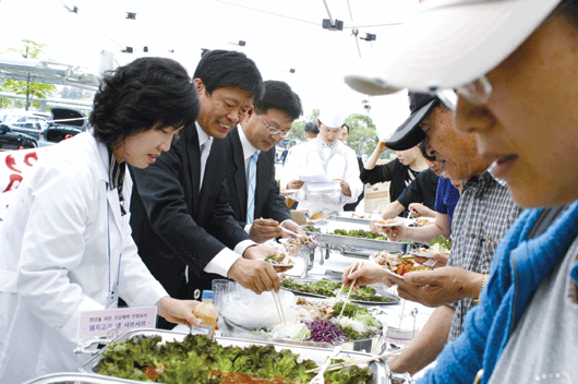 | 농촌진흥청 국립축산과학원은 지난 14일 수원농협 하나로클럽에서 ‘가족애’돼지고기 건강요리 콘테스트를 개최했다. 특히 이날 콘테스트에는 비선호부위인 돼지고기 뒷 다리살에 한정, 요리경연대회를 열어 눈길을 모았다. 이날 콘테스트에는 30여점이 출품, 1등 ‘끝내줘요’상에는 김태현씨가 출품한 ‘김치말이 미트로프’가 차지했다. 또 2등 ‘멋져요’ 상에는 국립축산과학원의 류재규 연구관을 비롯, 박찬유, 김선영, 배영미, 손미영씨 등 5명이 수상의 영예를 안았다. 축산과학원 라승용 원장(왼쪽 두 번째)과 이상철 부장이 수원농협 하나로클럽을 찾은 소비자들에게 돼지고기요리를 나눠주며 시식을 권하고 있다. |