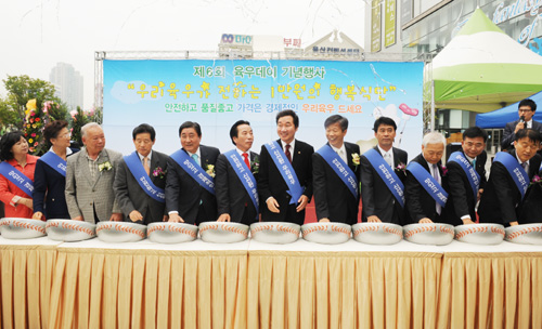 “신선하고 맛있을 뿐만 아니라 가격까지 저렴한 육우고기 많이 드세요” 한국낙농육우협회(회장 이승호)는 지난 9일 서울 용산역 앞 광장에서 제 6회 육우데이 행사를 가졌다. 이날 행사장에는 국회 농해수위 이낙연 위원장을 비롯해 한나라당 김성수 의원(양주동두천), 농식품부 박현출 식품산업본부장 등이 참석했다. 또 조남조 사료협회장, 이재용 등급판정소장, 이창호 오리협회장, 김남용 고문, 박병철 육류유통수출입협회장, 서성배 계육협회장, 유재춘 축산기업조합회장 등 200여명도 함께했다. 이날 행사는 ‘우리육우가 전하는 1만원의 행복 식단’이란 주제로 무료 시식행사를 비롯해 온란인블로거 요리대회, 로데오게임, 타악난타 공연 등 다양한 이벤트가 마련됐다. 이와 함께 낙농육우협회와 축산기업조합중앙회는 국내산 육우고기 소비촉진을 위한 협약식도 가졌다. 이승호 회장은 인사말을 통해 “그 동안 육우고기는 젖소고기, 수입육으로 오인받으며 제대로 평가받지 못했다”라며 “우수성과 안전, 가격경쟁력을 갖춘 육우가 국내 쇠고기 시장을 지켜나가는데 첨병역할을 다해 나갈 것”이라고 말했다. 이낙연 위원장은 축사를 통해 “육우산업의 가장 큰 적은 오해와 무지라고 생각한다”며 “맛도 좋고 몸에도 좋을 뿐만 아니라 가격도 저렴한 육우에 대한 오해를 풀어 육우산업이 한층 더 발전하기 기대한다”고 말했다. 또 박현출 본부장은 “가격이 저렴하면서도 품질이 우수한 육우고기가 제대로 평가받지 못한 것은 사실”이라며 “정부와 업계 힘을 합쳐 소비자들과 소통을 통해 육우고기를 제대로 알려 나가자”고 지적했다. 라기혁 육우분과위원장은 “육우농가들은 소비자들에게 안전하고 신선한 국내산 쇠고기를 공급하고 있다는 자부심으로 육우를 기르고 있다”며 “수입육보다 안전하고 맛있는 육우고기를 많이 소비해 달라”고 당부했다. |