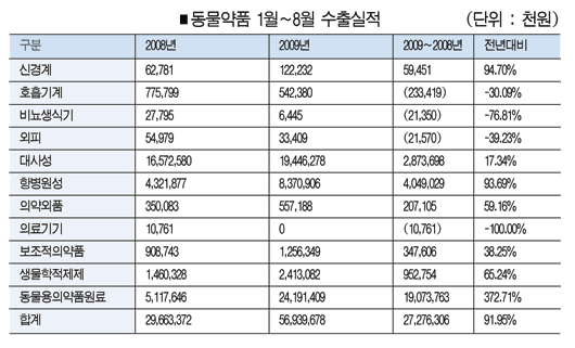 원료 373% 증가 ‘최대 활약’…항병원성약도 선전 동남아 넘어 중동·아프리카·중남미로 영역 넓혀 동물약품 수출이 폭발적인 신장세다. 국립수의과학검역원과 한국동물약품협회에 따르면, 올들어 8월까지 동물약품 수출액은 569억원으로 전년동기 297억원을 무려 92% 뛰어넘었다. 동물약품 원료의 활약상이 컸다. 원료는 242억원을 수출해 지난해 같은 기간 51억원보다 373% 늘어났다. 이중 백광산업은 상반기에만 214억원을 수출하며 전체 수출실적의 38%, 원료의 88.6%를 점유했다. 대사성약 수출액은 194억원으로 전년대비 17% 성장했다. 특히 대사성약 중 수출상위품목인 엘지생명과학의 부스틴-에스와 부스틴 250은 전년보다 각각 17%, 32% 증가한 109억원과 53억원 어치를 수출해 일약 ‘글로벌 스타제품’으로 등극했다. 항병원성약도 눈부셨다. 항병원성약은 전년 43억원보다 94% 증가한 84억원을 수출했다. 이 밖에도 생물학적 제제, 신경계, 보조적의약품, 의약외품 등이 성장세를 걸었다. 특히 동남아지역에서 탈피해 중동, 아프리카, 중남미 등지로 수출영역이 넓어진 것이 고무적이다. 업계는 수출호조에 대해 “우선 당장의 수익을 쫓지 않고 장래를 보고 투자를 지속한 데서 이유를 찾을 수 있다. 또한 유럽기업보다는 가격경쟁력이 있고, 중국이나 동남아 국가보다는 품질경쟁력을 갖추고 있는 제품으로 승부를 한 것이 큰 효과를 봤다”고 설명했다. |
