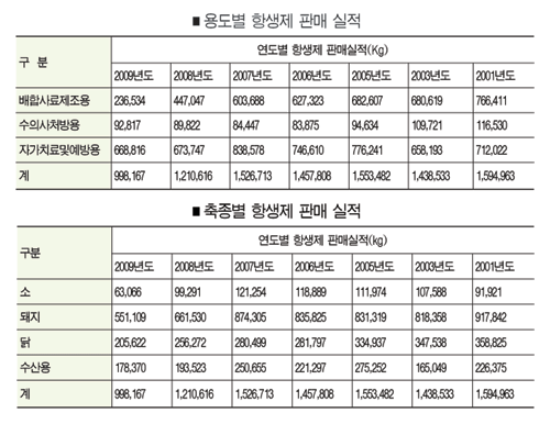 지난해 축산용 항생제 사용량이 크게 감소한 것으로 나타났다. 국립수의과학검역원이 수행한 ‘가축 및 축산물 내 주요 항생제내성 실태조사 및 평가" 사업결과에 따르면, 지난해 전체 축산용 항생제의 사용량은 998톤으로 전년 1,211톤보다 18% 줄었다. 지난 2001년 1,595톤과 비교해서는 37%나 감소한 수치다. 검역원은 지난 2005년 이후 농식품부에서 추진해 온 배합사료 제조용 항생제 감축정책이 항생제 사용감소에 영향을 미친 것으로 분석했다. 실제 지난해 배합사료 제조용 항생제 사용량은 237톤으로 전년 447톤에 비해 47%, 2001년 766톤보다는 69% 감소, 상대적으로 낙폭이 컸던 것으로 조사됐다. 축산용 항생제 사용량은 모든 축종에서 감소한 것으로 나타났다. 돼지와 닭은 각각 551톤, 206톤 사용돼 전년대비 약 17~20% 줄었다. 소는 63톤 사용으로 약 36% 감소했다. 지난해부터 배합사료용으로 사용이 금지된 린코스아마이드계 항생제가 전년보다 약 53%, 테트라싸이클린계 항생제가 약 39% 감소했다. 단일제제 중에서는 네오마이신(아미노글루코사이드계)이 약 77%가 줄었다. 한편 지난해 가축의 항생제 내성률(대장균 기준)은 테트라싸이클린, 네오마이신 등 항생제별로 점차적으로 감소하는 경향을 보였다. 테트라싸이클린은 소에서는 예년과 같지만 돼지와 닭에서는 내성률이 감소된 것으로 나타났다. 네오마이신의 경우 모든 축종(소·돼지·닭)에서 내성률이 줄었다. 다만, 세프티오퍼, 세파졸린, 아목사실린·클라벤닉산, 스트렙토마이신 등 일부 항생제(4종)는 치료용으로 계속 사용되고 있어서 2개 이상 축종에서 내성률이 다소 증가됐다. 정석찬 검역원 세균과장은 "앞으로도 배합사료제조용 항생제 감축, 무항생제 축산물 인증제, 축산농가에 대한 교육·홍보 등을 지속적으로 전개해 항생제 사용량과 내성률을 꾸준히 줄여나갈 방침"이라고 말했다. |