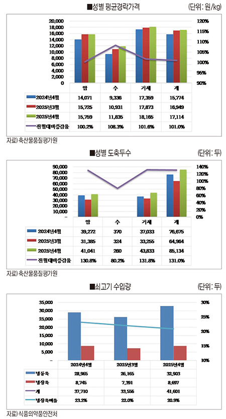 2025년 4월 한우 시세는 도축두수 증가로 인한 공급량 증가와 소비자 물가 상승 및 경기 침체로 인한 소비위축에도 불구하고, 군 급식, 학교급식, 봄꽃 축제 및 가족 단위의 행락객 증가, 한우 할인판매 행사 및 가정의 달 수요 물량 준비 등으로 인한 수요 증가로 전월대비 약강세를 보였다.