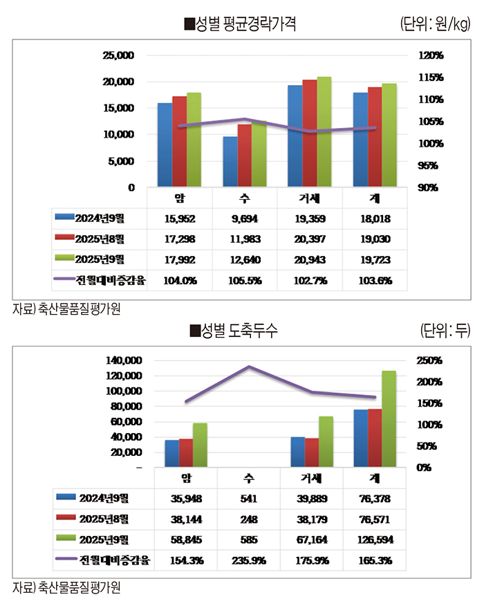 2025년 9월 한우 시세는 소비자 물가 상승과 경기침체로 인한 소비위축, 도축두수 증가로 인한 공급량 증가에도 불구하고, 군 급식, 학교 급식, 유통업체 추석 선물 세트 준비, 2차 민생회복 소비쿠폰 지급, 한우 할인판매 행사, 유통업체 추석 수요 물량 준비 등으로 인하여 전월대비 약강세를 보였다.