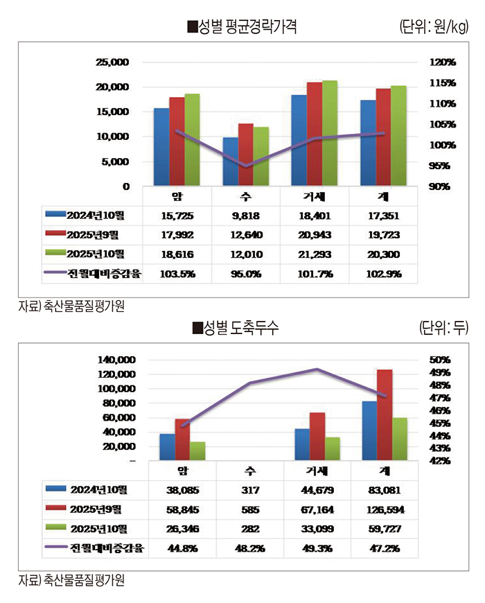 성별 경락두수 비율은 암소 59.7%, 수소 42.9%, 거세 65.6%로 전월대비 거세는 1.3% 증가하였으나, 암소는 3.5%, 수소는 6.8% 감소하였다. 암소 도축률은 44.1%로 번식의향 증가의 영향으로 전월대비 2.4% 감소하였으며, 전년동월대비도 1.7% 감소하였다.