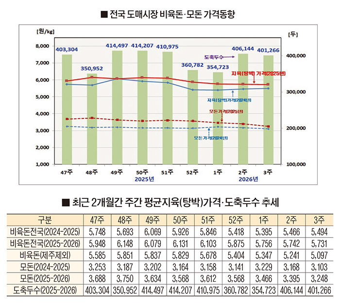 돼지 도축두수는 올해 1월 첫째주 35만4천723두로 전주보다 1.7% 줄었지만 둘째주에는 40만 6천144두로 전주 보다 14.5% 증가했다. 그러나 1월 셋째주에 40만1천266두를 기록하며 전주보다 1.2% 늘어나는 등 증감이 반복되고 있다. 이는 전년동기 대비 9.2% 감소한 물량이다. 2025년 한해 출하된 돼지는 1천870만9천412두로 전년의 1천902만1천121두 보다 1.6% 감소했고, 돼지가격은 지육 kg당 월 평균 5천779원으로 전년의 5천239월보다 10.3% 높았다.