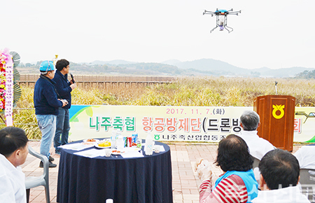나주축협(조합장 김규동)은 지난 7일 전남 나주시 공산면 동촌리 소재 우습제에서 강인규 나주시장, 김판근 나주시의회 의장과 박왕규 광주전남축협운영협의회장을 비롯한 전남지역 축협조합장, 축산관계자 등이 참석한 가운데 ‘항공방제단 드론방역 시연회’<사진>를 개최했다.