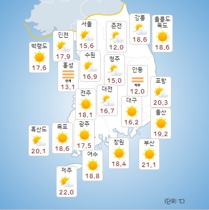 - 내일(12일) 아침최저기온은 7~16도, 낮최고기온은 21~24도가 되겠습니다.