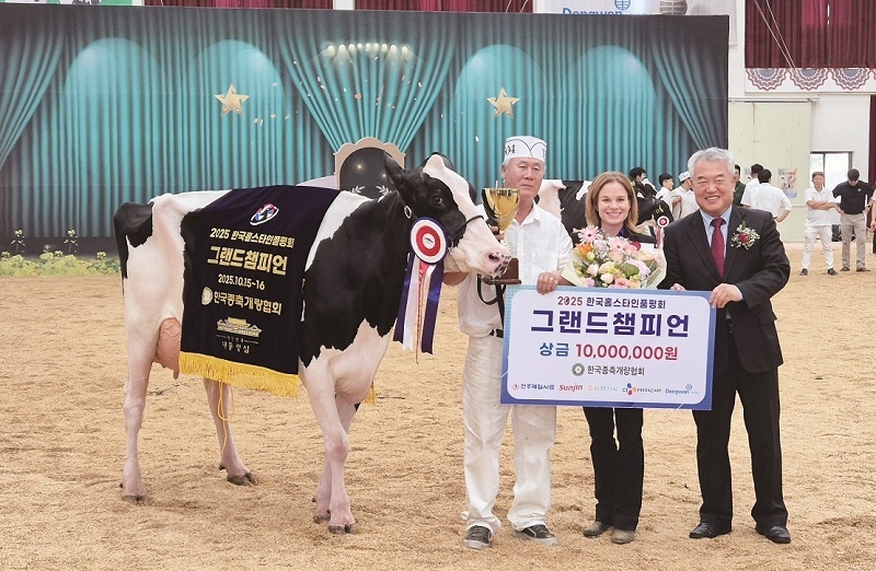 [축산신문 민병진 기자] 낙농가들의 대축제, ‘2025 한국 홀스타인 품평회’가 지난 15~16일 양일간 농협 안성팜랜드에서 성황리에 마무리됐다. 이번 대회엔 전국 69농가에서 169두를 출품, 총 21개 부문에서 열띤 경합을 벌였다. 특히, 올해에는 경기 포천 노곡목장(대표 최명회)에서 대회 최초로 그랜드챔피언과 준그랜드챔피언을 동시에 배출하는 진기록을 달성, 현장의 분위기를 뜨겁게 달궜다. 사진(왼쪽부터)은 그랜드챔피언 수상축과 함께 최명회 대표, 심사위원 몰리슬론, 한국종축개량협회 이재윤 회장이 기념촬영을 하고 있는 모습.