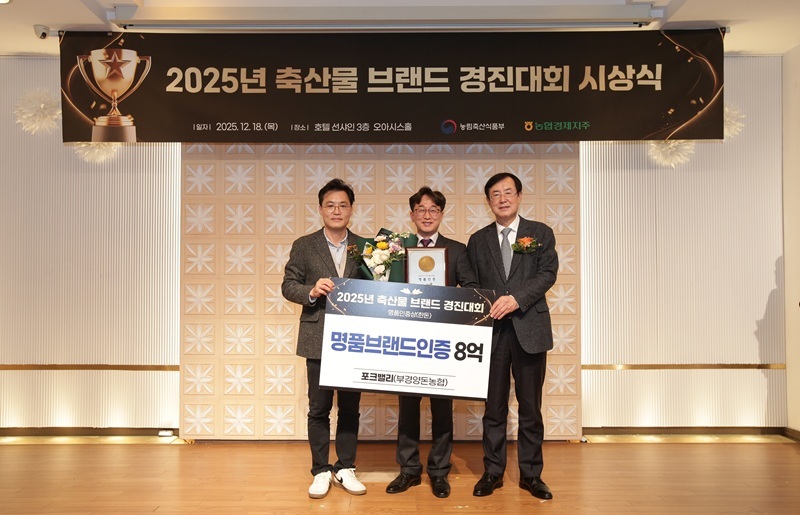 부경양돈농협(조합장 이재식)의 대표 브랜드 ‘포크밸리’가 12월 18일 농림축산식품부가 주최하고 농협경제지주가 주관한 ‘2025년 축산물 브랜드 경진대회’에서 한돈 부문 ‘명품인증상’을 수상했다. 이번 수상으로 포크밸리는 무이자 인센티브 자금 8억 원을 지원받게 되며, 인증 유효기간은 2026년 1월부터 2027년 12월까지 2년간이다.