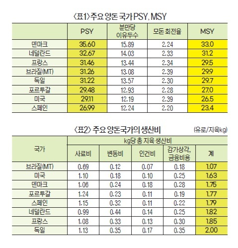 이에 따르면 양돈 생산성의 대표적인 지표인 PSY와 MSY 모두 덴마크가 전 세계에서 가장 많았다.