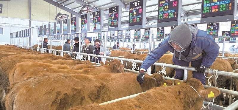 [축산신문 기자] 수도권 최대 스마트전자경매시장인 양평가축시장이 지난 7일 첫 개장을 하고 송아지 경매를 진행했다. 송아지 경매에 앞서 경기 양평군 양서면 소재 개포동물병원 김원배 원장이 구충제와 대사촉진제를 접종하고 있는 가운데 송아지 경매에 참여한 농가들이 송아지를 살펴보고 있다. 양평가축시장은 양평군 수의사회와 협약을 체결해 수의사회 회원들이 돌아가며 가축시장에 출품된 송아지에 구충제 및 대사촉진제를 접종하고 있다.