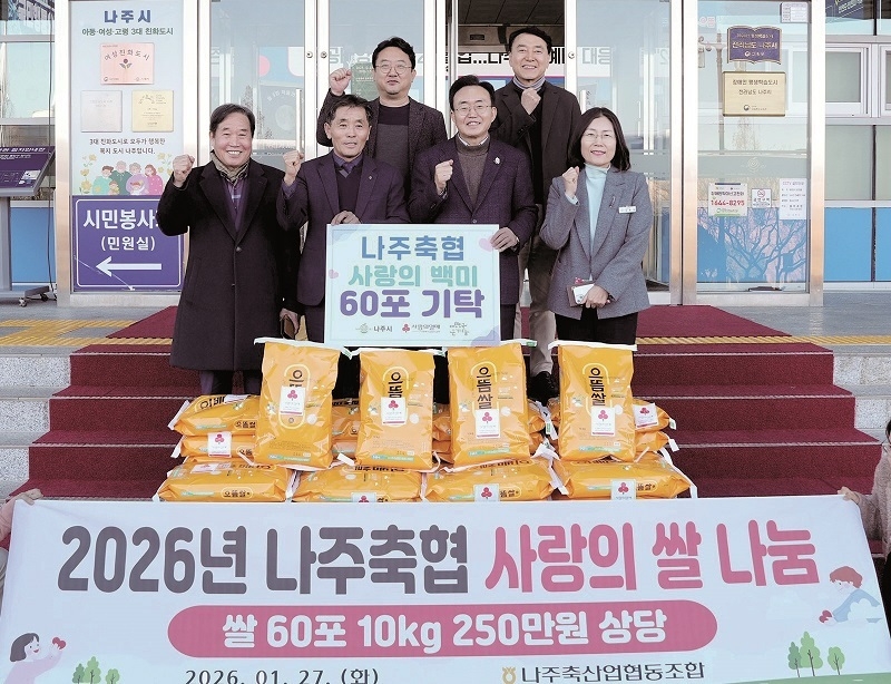 [축산신문 윤양한 기자] 전남 나주축협(조합장 나상필)은 지난 1월 27일 지역 내 저소득 다자녀 가정을 돕기 위해 나주시에 백미 60포를 기탁<사진>했다.