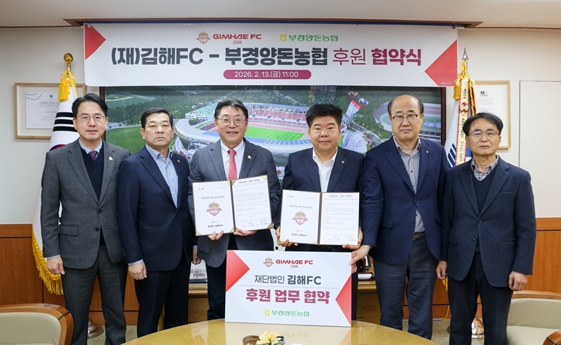 부경양돈농협(조합장 이재식)은 프로축구 K2리그 김해FC와 공식 후원 협약을 체결하고 2026시즌의 힘찬 출발을 응원했다. 지난 13일 김해시청에서 열린 협약식에는 부경양돈농협 이재식 조합장과 김해FC 구단주인 홍태용 김해시장이 참석한 가운데 진행됐다.