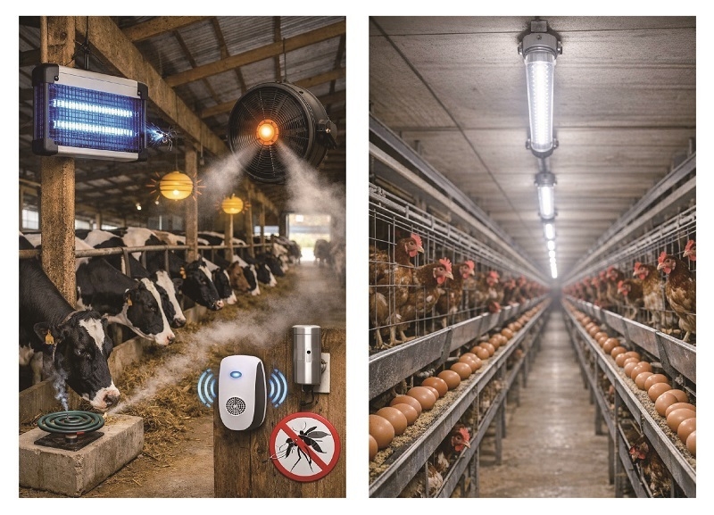 축사에서 조명의 중요성과 기본 원리는 축사의 밝기에 따라 가축의 생체리듬(일주기 리듬)을 조절하는 핵심 요소다. 빛에 의한 번식 능력 향상으로 젖소의 착유량과 산란계의 산란율, 양돈의 발정 주기와 생산성 향상을 들 수 있다.