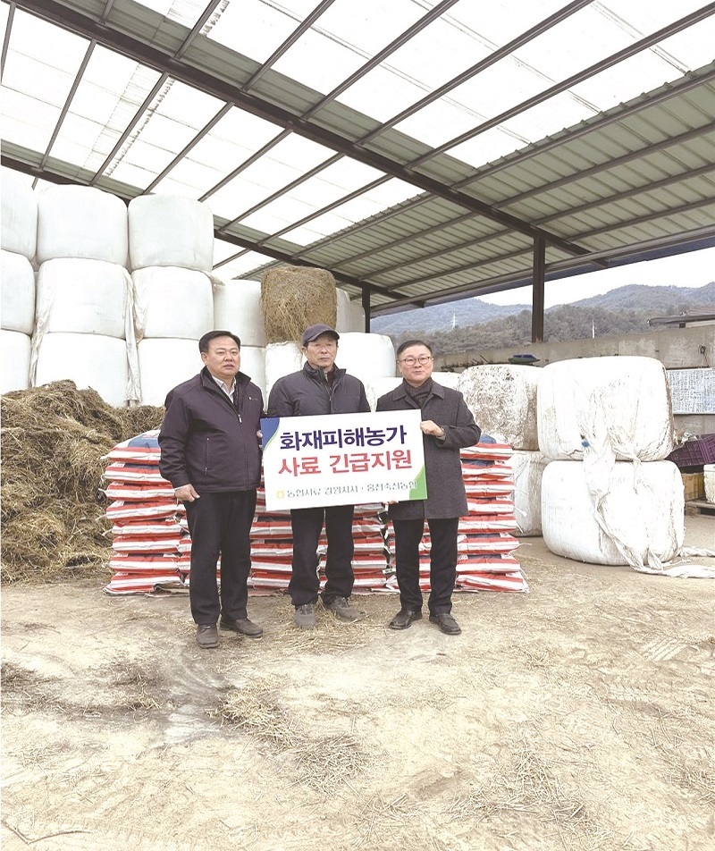 농협사료 강원지사는 지난 3월 10일 피해 농가를 직접 방문해 사료를 전달하며 화재로 어려움을 겪고 있는 농가의 조속한 회복을 기원했다.
