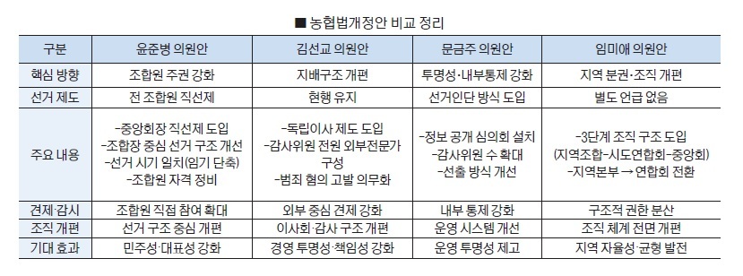 이처럼 각 개정안은 조합원 참여 확대, 외부 견제 강화, 정보 공개 확대, 지역 분권 등 서로 다른 해법을 제시하고 있지만, 궁극적으로는 농협 조직의 신뢰 회복과 체질 개선이라는 묵표를 공유하고 있다.
