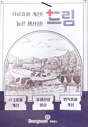 [축산신문 김영란 기자] 동원팜스(대표이사 노경탁)가 낙농사료의 명가로 이름으로 올린 데는 다 이유가 있다. 낙농사료의 특화된 제품에서도 알 수 있지만 이를 이용하고 있는 농가들의 성적에서도 확인할 수 있기 때문이다.