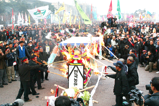 한미 FTA 국회 비준을 반대하는 전국 30여개 농축산단체들은 지난 25일 서울 여의도 문화마당에서 ‘11·25 농업인 전국대회’를 개최하고 한국FTA 국회비준 중단을 촉구했다. 국회 농림수산식품위원회 이낙연 위원장을 비롯한 일부 야당의원들도 자리를 함께 한 이날 대회에서는 전국에서 상경한 농축산인들과 재야인사 등 2만여명이 ‘NO FTA’, ‘한미 FTA반대’ 등 구호를 외치며 투쟁의 목소리를 높였다. 이들은 계속되는 사료값, 비료값 등 생산비 폭등 속에 농축산물의 가격 폭락과 함께 농가 부채가 늘어나면서 공황 상태인 농촌의 현실에는 아랑곳 않고 정부와 여당은 한미 FTA 국회비준을 무리하게 추진하려 한다며 분노를 표출했다. 사진은 농축산단체대표들이 한미FTA로 인해 고사돼 가는 한국 농축산업의 미래를 상징하는 퍼포먼스를 벌이고 있는 모습.