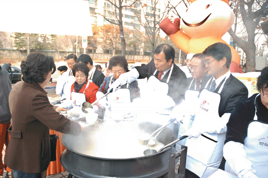 “뜨끈한 한우곰탕으로 추위를 이기세요.” 농협중앙회는 지난달 28일 농식품부와 한우자조금 후원으로 한우고기 부산물 소비촉진과 한우 산지가격 안정을 위해 농협서울지역본부 직거래장터에서 한우 사골곰탕 5천 그릇을 소비자들에게 배식했다. 이번 한우 부산물 소비촉진행사는 다음날까지 이어졌으며, 겨울철 대표음식인 사골 만두국을 비롯한 요리전시회와 한우부산물에 대한 소비자 설문조사로 진행됐다. 직거래장터에서 한우 사골곰탕을 소비자들에게 배식하고 있다. 오른쪽부터 노수현 농식품부 축산경영팀장, 오세관 농협축산지원부장, 남호경 한우자조금관리위원장.