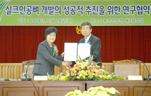특히 인공뼈 개발연구는 농업 BT, NT와 의과대학의 첨단 의생명공학기술을 접목하여 농생물소재를 고부가 인공뼈와 같은 의료용 소재로 개발하는 최초의 시도로 연구 영역의 확대는 물론 국민건강에도 크게 기여할 것으로 기대된다. 이번 농촌진흥청에서 인공뼈 소재로 이용하게 될 실크단백질은 그동안 많은 연구를 통해 생체안전성과 생체적합성이 검증된 천연 단백질로 그동안 수술용 봉합사, 기능성 실크 화장품을 비롯해 최근에는 기억력 증진 효과를 가지는 기능성 식품 소재인 BF-7 개발에 이르기까지 다양한 용도로 개발해 산업화에 성공했었다. 그 실적으로 누에를 통해 농가에서 손쉽고 경제적인 대량생산이 가능한 누에고치는 순수한 천연 실크단백질로 오랜 기간 동안 외과수술용 봉합사로 사용되어 왔다. 또한 실크단백질은 생체내 콜라겐 등 세포외물질의 분비를 촉진하는 효과가 있을 뿐 아니라, 섬유아세포, 연골세포, 골아세포 등에 대한 우수한 세포 부착 및 배양 특성을 확인한 바 있다. |
