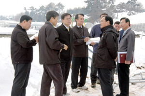 김재수 농촌진흥청장<사진 왼쪽 세번째>은 지난달 29일 폭설로 인해 시설하우스가 붕괴된 충남 당진군 고대면에 위치한 아스파라거스 재배단지와 축사 붕괴 등의 피해를 입은 농가를 직접 방문해 피해현황을 살펴보고 농업인들을 격려<사진>했다.