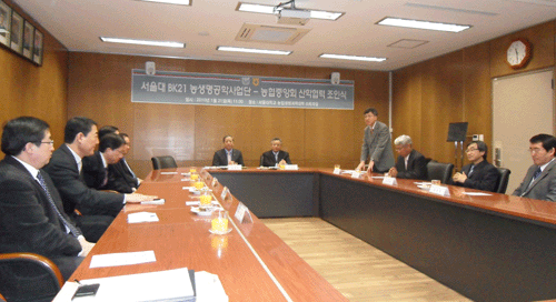 서울대학교와 농협중앙회가 산학협력 협약을 체결했다. 농협축산경제와 서울대는 지난 21일 서울대 농업생명과학대학 교수회의실에서 산학협력 조인식을 갖고 사료분야와 축산물 가공식품 개발 및 임직원 교육 프로그램 등 다양한 분야에서 상호 협력해 나가기로 했다. 이날 조인식에는 서울대에서 서진호 산학협력단장과 박은우 농업생명과학대학장, 임정묵 BK21농생명공학사업단장, 최윤재 평창그린바이오사업단장, 김정한 농생대 부학장(BK21사업단 산학협력위원장), 유상렬 교수(BK21사업단 실무위원) 등이 참석했다. 농협축산경제에서는 남성우 대표를 비롯해 오세관 상무, 이병하 농협사료 사장, 양두진 농협목우촌 사장, 이환원 축산경제기획부장, 박인희 경제전략팀장 등이 참석했다. 서진호 단장은 이날 조인식에서 “우리나라 21세기 생명공학 발전은 물론 축산농가와 축산업 발전에 최선을 다하겠다”고 말했다. 서 단장은 “평창그린바이오 첨단연구단지의 성공을 위해서도 오늘의 협약은 매우 중요한 것으로 생각한다”고 말했다. 남성우 대표는 “평창그린바이오사업에 참여하는 방안도 실무적으로 적극 검토하고 있다”고 소개하고 “앞으로 서울대의 우수한 연구와 두뇌, 시설, 교수들의 역량이 농협 사업과 잘 연계된다면 오늘 협약이 대한민국 축산업 발전의 견인차 역할을 하게 될 것”이라고 말했다. 남 대표는 “일선축협 조합장들의 자기계발에도 좋은 결과가 있고, 특히 사료와 목우촌의 경우 사업적으로 구체적인 연계 활동이 이뤄지기 바란다”고 말했다. |