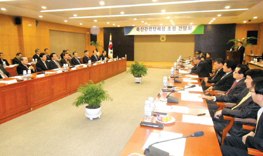 이날 농협본관 중회의실에서 열린 간담회에서 농협축산경제는 2010년 중점사업계획에 대해 설명하고 단체장들의 의견을 들었다. 농협축산경제는 이날 수렴된 단체장들의 의견을 사업에 적극적으로 반영할 계획이라고 밝혔다. 남성우 대표는 이날 “축산분야는 지난해 많은 어려움이 있었지만 위기를 잘 극복하고 있다. 농협도 단체장들과 힘을 모아 생산비와 유통비용 절감 등 축산업 발전에 기여해 나가겠다”고 말했다. 남 대표는 이어 “구제역이 종식되면 나눔축산 선포식을 갖고 축산단체와 함께 축산인들이 지역사회에서 부정적인 인식을 해소하는 나눔운동을 추진할 계획”이라고 소개했다. 이승호 축단협회장은 “농협축산경제와 축발기금은 축산인들의 자존심이다. 농협개혁과정에서 축산특례조항을 지켜 축산조직이 현행처럼 전문성과 독립성을 유지할 수 있도록 노력하자”고 말하고 “축발기금 존치평가에서 좋은 결과가 나올 수 있도록 단체장들이 힘을 모으자”고 당부했다. 이날 단체장들은 농협과 축산단체가 축산업계 현안에 대해 역할분담을 통해 공동 대응해야 한다고 입을 모았다. 이 자리에서는 우유 해외시장 개척, 구제역 등 질병관리, 계란유통구조와 육계 계열화사업 연구, 일선축협의 동물약품 취급, 사슴데이 등에 대한 농협의 관심과 업무협력을 당부하는 단체장들의 의견이 있었다. 또 쇠고기 이력제와 관련해 일선축협의 이표장착과정에서 질병정보까지 담는 것을 연구해 달라는 주문도 있었으며, 구제역 차단방역과 관련해 중국산 수입건초와 깔집, 외국인 노동자들의 집중관리도 필요하다는 의견이 제시됐다. 이날 단체장들은 농협중앙회 사업구조개편 과정에서의 축산조직의 전문성 확보와 함께 축산발전기금 존치평가 등과 관련해 축산업계의 의견을 관철시키기 위해 단체장들의 역량을 모아 나가기로 했다. 이날 간담회에는 농협에서 남성우 대표를 비롯해 오세관·김명기 상무와 이병하 농협사료 사장, 양두진 농협목우촌 사장, 중앙본부 부서장 등이 참석했다. 축단협에서는 이승호 회장과 남호경 한우협회장, 이병모 양돈협회장, 이준동 양계협회장, 강준수 양록협회장, 배경수 양봉협회장 등 축종별단체장들이 참석했다. 또한 정영채 수의사회장, 문제풍 낙농진흥회장, 석희진 축산물HACCP기준원장, 배상호 가축위생방역본부장, 조남조 사료협회장, 김진구 동물약품협회장, 이규태 유가공협회장, 박병철 육류수출입협회장, 김실중 육가공협회 부회장, 김명규 축산물위생처리협회장, 이용구 축산환경기계협회장, 김승목 대용유사료협회장, 김명호 가축인공수정사협회장, 김광수 단미사료협회장, 유동준 전 단미사료협회장, 노경상 축산경제연구원장, 그리고 자문단체인 축산신문 윤봉중 회장이 참석했다. |