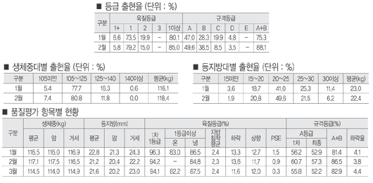 | 항목별 문제점 찾아 개선 방안 강구 품질평가사 컨설팅 자문도 큰 도움 좀 더 자세하게 각 항목별로 살펴보자. 여기에서 원인을 살펴볼 때 유전적인 부분은 제외한다. 왜냐하면 거의 모든 부분(결함이나 마무리 제외)에서 정도의 차이는 있지만 유전이 관여하지 않는 부분이 없기 때문이다. 육질에서 육색이나 조직감의 하락률이 높은 경우에는 속성비육 여부 또는 수송, 도축, 냉장과정을 살펴봐야 한다. 물론 계절적인 요인도 무시할 수 없다. 비육이나 균형에서 하락률이 높다면 살붙임정도와 체형 등이 좋지 않은 경우로 질병이나 사육환경을, 지방부착(규격)에서 하락률이 높은 경우에는 속성비육으로 인한 과비 또는 고열량에너지 사료를 급여했는지를, 결함(육질)이나 마무리(규격)에서 하락률이 높은 경우에는 질병 또는 상·하차시 취급 및 도축과정을 살펴봐야 한다. 평균하락률은 규격 7.7%, 육질 10.1%정도다. 품질평가에 관심이 있는 농가에서는 더 세분화해서 활용하는 경우도 있겠지만 위에서 설명한 내용정도만 숙지해서 반영하더라도 분명 도움이 될 것으로 확신한다. 여기에 한 가지 덧붙이면 매월의 분석결과를 한 눈에 볼 수 있도록 정리하는 일이다. 분석기간은 각 농장에 따라 적정하게 구분할 필요가 있다(종돈의 변화나 사료의 변화가 있을 때 등). 이 정리된 내용을 보고 가장 좋은 성적이 나왔던 때의 성적을 보면 사육방법, 출하시기 등에 대해 최적의 조건을 알 수 있다. 정리 방법은 전체의 내용을 하나의 표로 정리해도 좋고 또 항목별(등급출현율, 체중변화, 등지방두께, 하락률등)로 구분해서 관리하면 더욱 좋다. 컨설팅에서 경영자에게 권하는 내용이 있다. 그 하나는 등급출현율 목표를 A, B등급 몇%라고 하지 않고 A등급 몇% 이상으로 정하는 것이다. 목표를 단순화함으로서 규격돈 출하비율을 높이는데 효과적인 방법이 될 수 있다. 두 번째는 반드시 출하도축장에 한번이상 방문해서 본인이 출하한 돼지에 대해 품질평가사에게 설명을 들어보는 것이다. 막연히 “내 돼지는 좋은데 등급이 왜 이렇게 나오지?”하는 궁금증을 품고 만 있을 것이 아니라 직접 품질평가사에게 설명을 듣는 것이 실제적으로 더 큰 도움이 될 수 있다. ‘백문이 불여일견’이란 말이 꼭 맞는 경우다. 박해천 차장(축산물품질평가원 대전충남지원) |