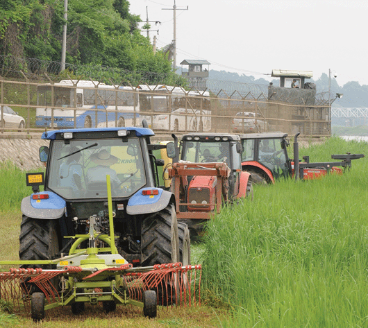 경기도는 지난 14일 어려워진 축산농가를 지원하기 위해 민통선내 군사작전구역에서 자라고 있는 자연산 갈대를 사료화하는 협약을 육군 1사단, 파주시, 파주연천축협과 체결하고 민통선내에서 조사료 생산 시연회를 가졌다. 민통선내 철책과 군 초소가 보이는 가운데 조사료 생산장비들이 자연산 갈대를 조사료화 하고 있다.