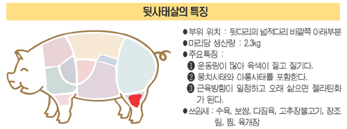 돼지고기를 삶을 때는 주로 어떤 부위를 사용할까? 설깃살 아래의 뒷사태살이다. 운동량이 많은 부위라 조금은 색이 짙고 질긴 편이지만, 장시간 삶으면 소화가 잘되는 동물성 단백질의 일종인 젤라틴(Gelatin)으로 변화되어 보쌈과 편육, 장조림으로 즐길 수 있다. 특히 이 부위 중심의 아롱사태는 천여 개가 넘는 힘줄로 이루어져 있어 그 맛이 독특하다. 삶은 돼지고기는 장수에 으뜸 음식이다. 평균수명이 높아 장수마을로 유명한 일본의 오키나와에서는 노인들이 삶은 돼지고기를 즐겨 먹는다. 우리나라 또한 장수하는 노인들이 으뜸으로 치며 즐겨 먹는데, 삶은 돼지고기 국물도 그냥 버리지 않았다. 펄펄 끓인 돼지 육수에 돼지갈비, 두부, 무 등을 다진 마늘로 양념하여 맑게 끓인 ‘돼지 접짝뼈국’은 시원한 국물 맛도 일품이지만 과거에는 결혼식 날 신부에게만 줄 정도로 귀한 음식이었다. (자료제공:농협중앙회)