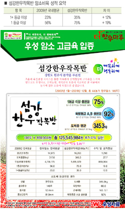 우성사료(대표이사 지평은)가 섬강한우작목반에 대한 우수농장의 날을 시작으로 하반기 닻을 올렸다. 지난 14일 강원도 원주시 문막읍 소재 문막농협 2층 회의실에서 이 지역 한우경영인으로 구성된 섬강한우작목반 80여명이 모인 가운데 열린 우수농장의 날은 구제역 발생 종식 이후 처음 개최된 행사다. 암소비육 산차·BCS초점 체계화된 제한급여 실천 육질 초음파 등 질 높은 서비스도 괄목성적 뒷받침 이번 우수농장의 날 행사에서는 한우경영인들이 궁금해 하는 시장 상황과 앞으로의 전망에 대한 정보를 공유했으며 특히, 우성사료의 더 한우마루 암소프로그램에 대한 관심이 집중됐다. 이날 행사에서 섬강한우작목반에서 출하한 44농가의 한우암소 146두의 우수 성적을 소개하고 급여 프로그램과 사육 노하우를 소개했다. 성적 소개에 따르면 1등급 이상이 국내 평균보다 19% 더 높은 75%, 1+등급 이상이 국내 평균보다 12% 더 높은 35%이며, 육량 A, B등급이 92%로 국내평균대비 두당 약 86만원의 추가수익을 올린 것으로 나타났다. |