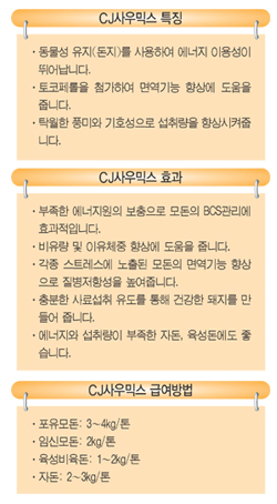 동방과 양돈 세미나 개최…수태율 향상 노하우 공유 무더위로 생산성 저하에 고민하는 양돈고객들에게 CJ제일제당 사료BU가 시원한 바람을 선사하고 있다. CJ는 7월 중순부터 8월말까지 에너지 보충 및 기호성 개선을 위한 탑드레싱 사료인 CJ사우믹스 <사진>1+1 행사를 실시하고 있다. 이번 프로모션은 하절기 생산성 향상 위한 CJ의 적극적인 조치로 더위 스트레스로 인한 사료섭취량 감소 및 BCS 관리를 효과적으로 관리하기 위함이다. 정종율 양돈PM은 “이번 프로모션은 고객이 인정하는 가치를 지속·발굴해서 얻은 하절기 솔루션이며 신속한 현장접목으로 고객만족을 극대화 할 예정”이라고 한다. CJ사우믹스 외에도 전국적으로 수태율 향상 세미나와 현장 서비스 활동을 시행하고 있다. 하절기 수태율은 내년 성수기 출하두수와 직결되기에 (주)동방과 함께 ‘양돈사업 하절기 생존전략’ 세미나를 개최하여 Know-How를 공개한다. 농장수익성 개선에 관심있는 사양가들은 이번 세미나를 통해 앞으로의 양돈시황과 성공전략을 심도있게 전수 받을 수 있다고 한다. 또 현장 서비스 활동으로 사료급이 라인의 크리닝 서비스와 음수관리 서비스를 진행하고 있다. 크리닝 서비스는 피드빈 청소, 피드빈 개폐기 끈 교환, 피드빈 제품명 스티커 부착 등을 실행하며 음수관리 서비스는 CJ음수투약 프로그램(음수용 소독제)을 활용한 서비스를 말한다. 이밖에도 모돈 열사병 방지를 위한 냉수·얼음관장기 서비스는 올해도 적극 시행하고 있으며, 차별화된 서비스로 열화상카메라를 이용한 배전판 등 돈사내 전기점검으로 고객의 안전과 재산의 지킴이 역할을 톡톡히 하고 있다. |