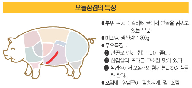 심혈관계 질환과 암을 일으키는 활성산소 제거 성분이 풍부해 노화 방지에도 효과적인 돼지고기, 그래서 임금님도 즐겨 먹었다는 돼지고기의 씹는 맛을 제대로 느껴보고 싶다면 오돌삼겹을 먹어보라. 오돌뼈가 오도독 오도독 씹히는 맛은 어느 부위에서도 맛볼 수 없는 특별한 즐거움을 준다. 삼겹살과는 또 다르게 고소한 맛을 선사하는 오돌삼겹, 오늘은 오돌삼겹 한 점 달게 씹으며 사람과 일생을 함께하며 건강과 행운을 안겨주는 돼지고기의 참 맛을 음미해보자. (자료제공:농협중앙회)